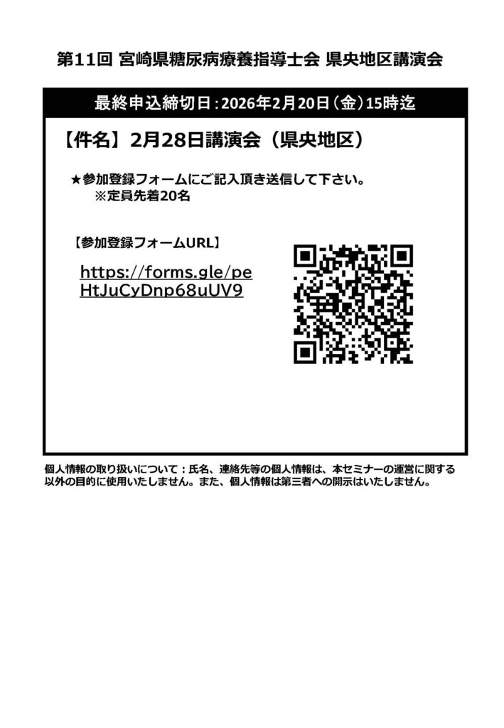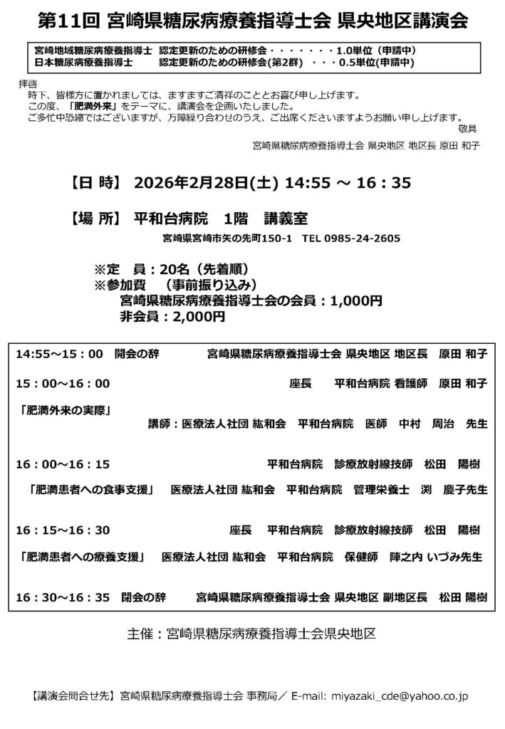 問合せ先:宮崎県糖尿病療養指導士会事務局 e-mail/miyazaki_cde@yahoo.co.jp